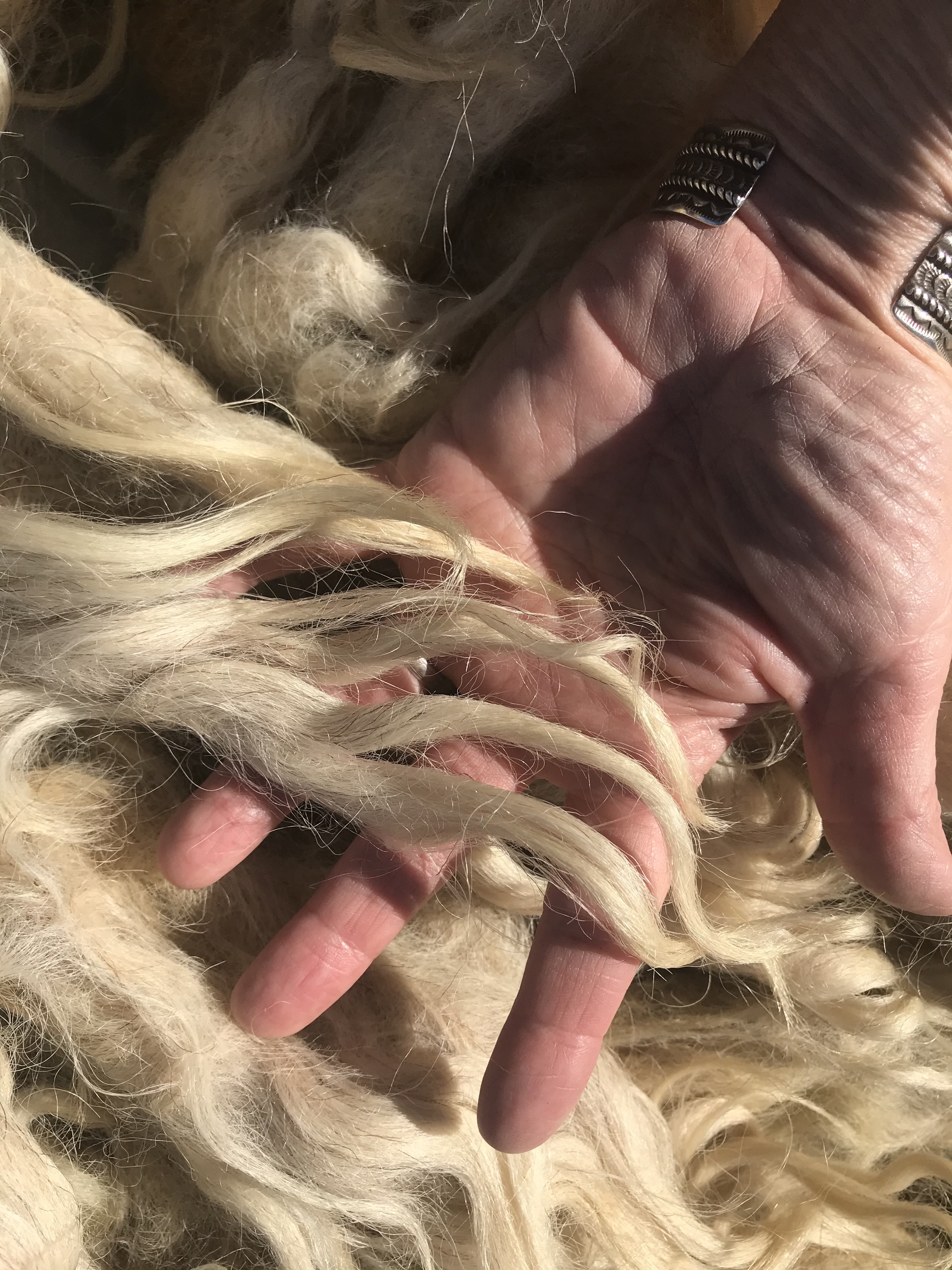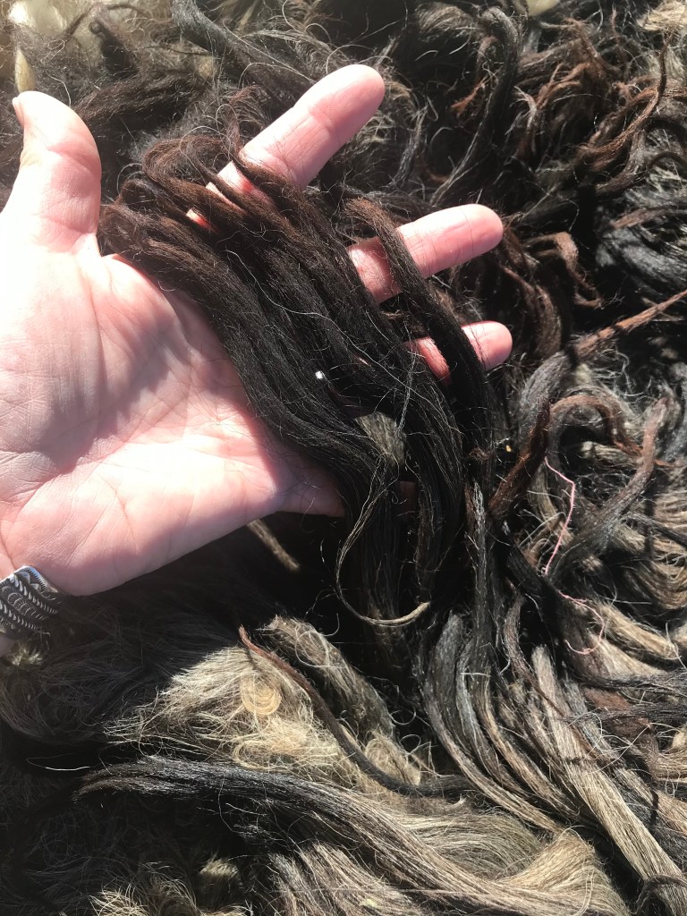 Alexander and Roxanne are a Karakul sheep couple located in Tuscon, Arizona. In January of 2020 I was able to procure a half fleece from each of them from Sonja at The Farm at the End of the Road in Queen Creek. I could have had all of both fleeces, and in hindsight that would have allowed me to make a full size cloak. But I was so overwhelmed by the size of them, and took what I thought I could handle. Karakul are double coated, long tip sheep that originated in Namibia, Africa. They are well adapted to the heat and prosper in Arizona. Sonja raises them as part of the Shave’em to Save’em program sponsored by the Livestock Conservancy.