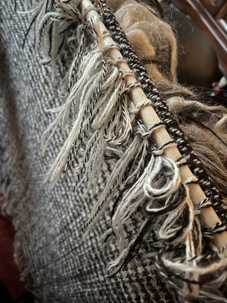You wouldn’t imagine that such a thick pile (the locks ranged from 10 – 12 inches) could produce such a wonderful drape, but it did. It certainly wasn’t quick weaving. Prepping the locks was a process in and of itself. The sheared end of each lock (which still had a smidgeon of undercoat) was felted together so that when it was placed in the warp using the Icelandic Knot, the original length of the lock was mostly preserved. On April 24. 2022 I beamed the warp. on May 3, 2022 I cut the cloak off the loom.