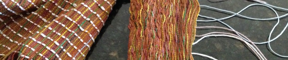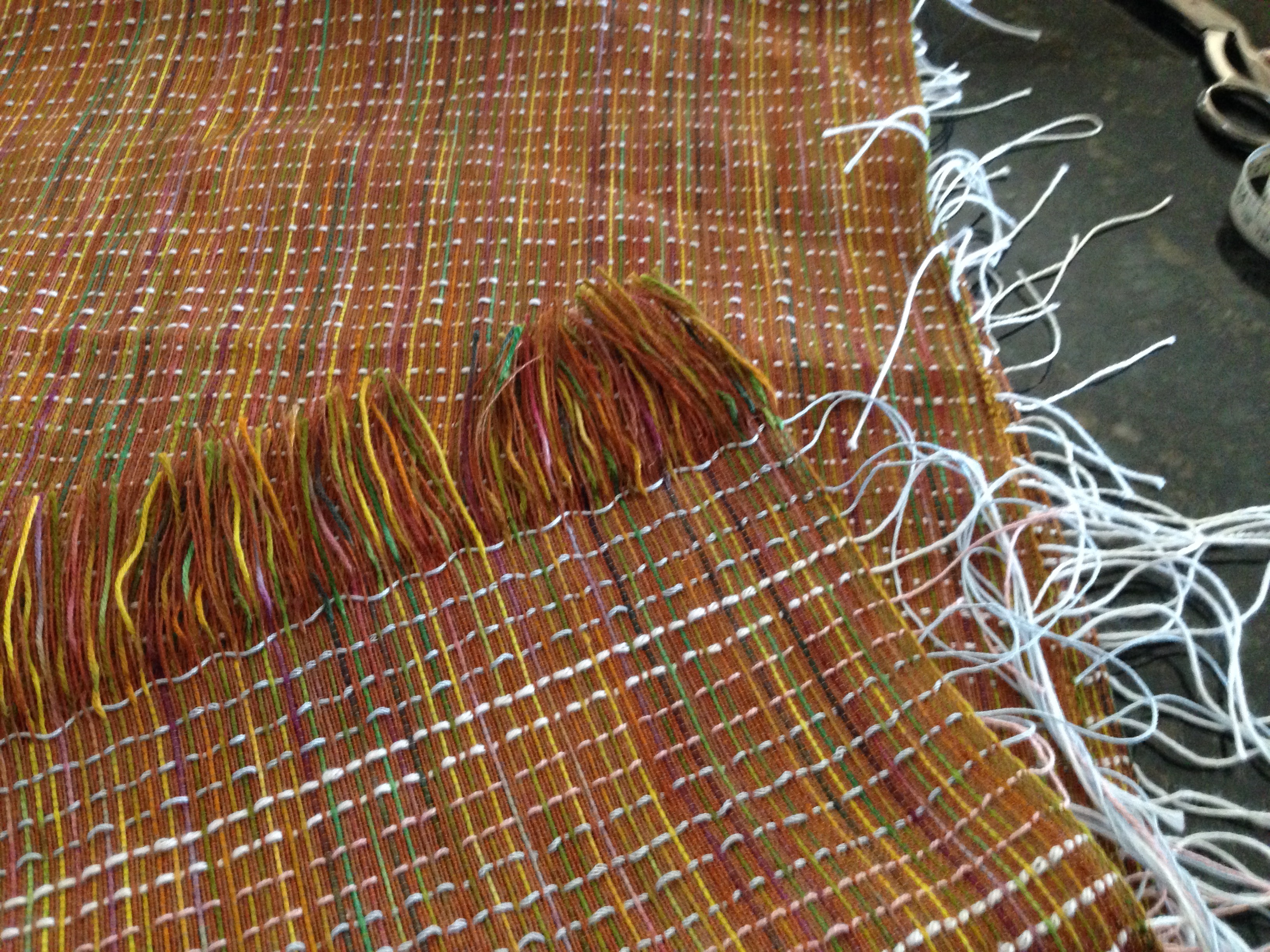 IMG_1730My three-yard warp had three fibers – DK sock weight yarn that I hand-dyed in a class last October, 100% 16/2 linen, and 2/8 Tencil.  18 ends per inch, alternating sock yarn in one dent, and the  linen and Tencil in the alternate dents on a twelve dent reed.  The weft was Guterman Toldi-Lock overlocking thread, which is 100% polyester.  The white threads in the warp are the “pulling” threads, which are 8/2 cotton.  A lot of people use upholstery thread, but this is what I had on hand. In this picture you can see both sides of the cloth, with the pulling threads dormant.