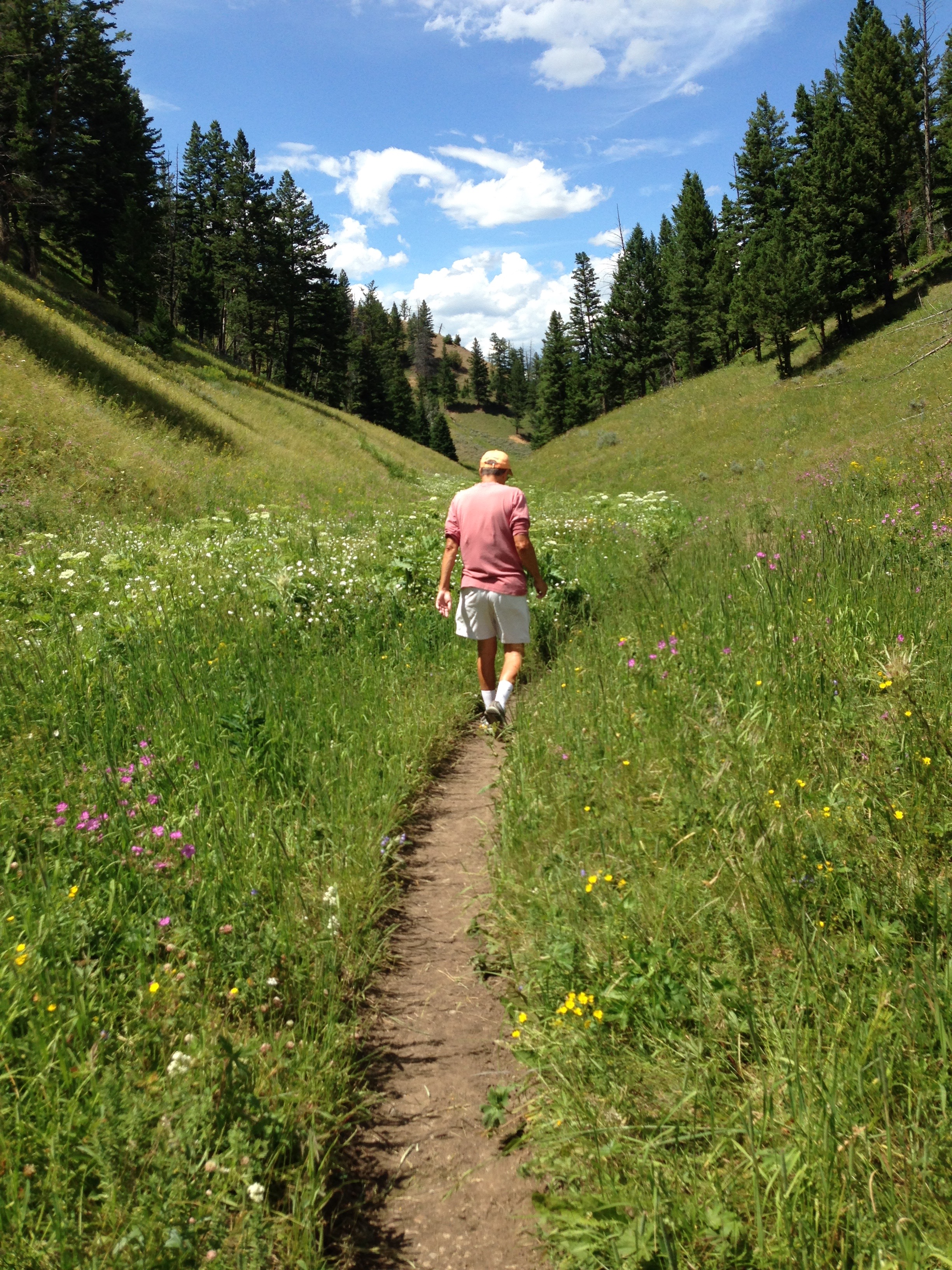 Our daily goal of keeping up with our hourly walks urged us to hike the Lost Lake Trail, which we picked up from the Roosevelt Lodge. It was a little backtracking because the road for the top of the trailhead (Petrified Tree) was closed for repair. We got to see the Petrified tree, anyway! In some ways I suppose that urban trails have spoiled us, because we were not prepared for the landscaping of most of the trails. Lost Lake was almost like an animal path. At one point the grasses were shoulder high, and I was announcing myself as I walked along just in case anything was hanging around in the grass. If you know what I mean. (This was bear country, after all.) Reaching the top of the ridge was like being in the opening sequence of the Sound of Music. On the final approach, as the grasses were shoulder high and I could catch sight of the back of the Ranger Station, I lost track of Denny and kept my eye on the prize – the end of the trail. Later Denny explained his delay – he saw a black bear rummaging at the back of the Ranger Station and had held back, debating on whether to go ahead. Seems I had waltzed right by without noticing a thing. Live and let live!
